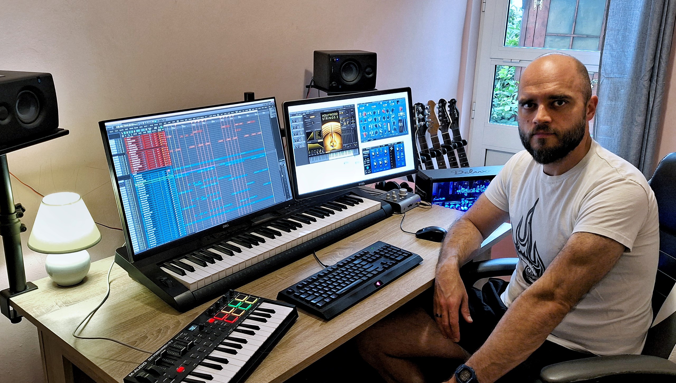 I've watched videos about sound design, composing music, and using different instruments. I play electric guitar, bass guitar, and keyboards. Keyboards are something I've recently started using, but now I use them the most because all music composition on the computer is done through the keyboard. The MIDI keyboard triggers the sounds I want, whether it's a choir, cello, organ, electric guitar, or something else. If I need to record electric guitar, then I play it myself.